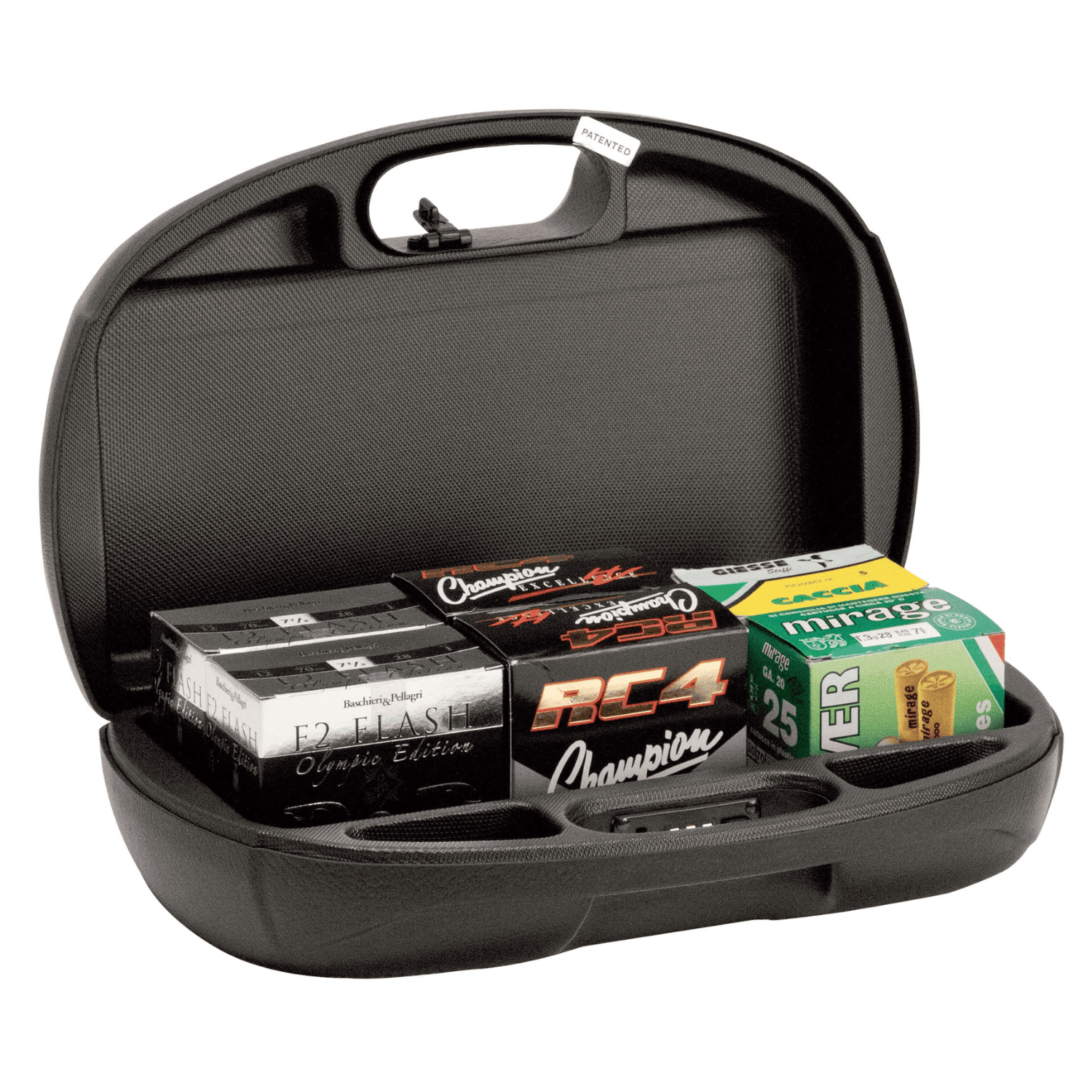 Este estojo / case é indicado para armazenar adequadamente até 06 caixetas (150 cartuchos calibre 12GA). Garante excelente resistência, protegendo contra esmagamentos involuntários e organizando seus cartuchos na pedana e no transporte de sua casa para o clube ou local de competição.