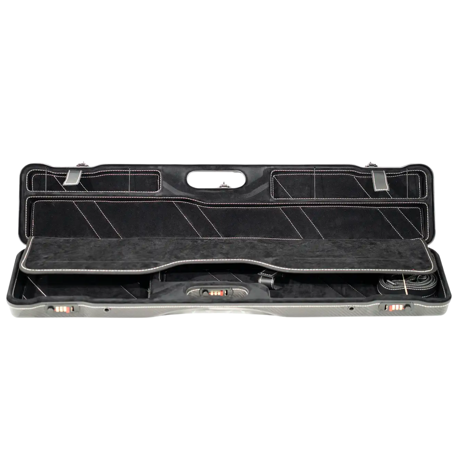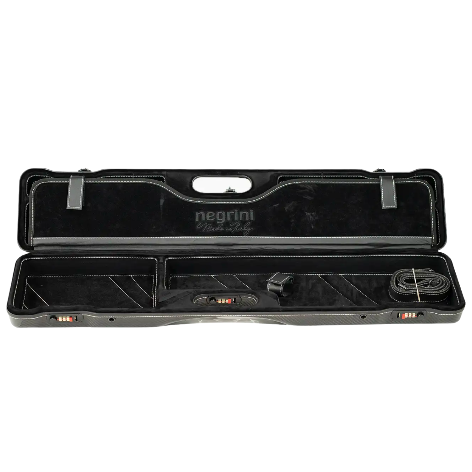 O case da série 16407 em fibra de carbono foi projetada para acomodar espingardas esportivas com canos de até 32 polegadas. Pesando apenas 3 kg, este case rígido de luxo para espingarda é ultracompacta e ultraleve. A versão Sporter em Fibra de Carbono é aprovada para viagens aéreas e possui um sistema de bandoleira costurada em couro italiano com sistema de liberação rápida para uso com as mãos livres. O Case Compact Sporting apresenta um interior luxuoso com estofamento personalizado feito à mão e foi projetada com compartimentos separados para a coronha e o receptor, além de todos os acessórios em um dos lados, e espaço para o cano com a telha na parte superior da capa. Fabricada com a tecnologia de parede dupla rígida em compósito da Negrini, o case abre 180° para facilitar o acesso e possui 3 fechaduras de combinação em aço aprovadas pela TSA para maior segurança.
