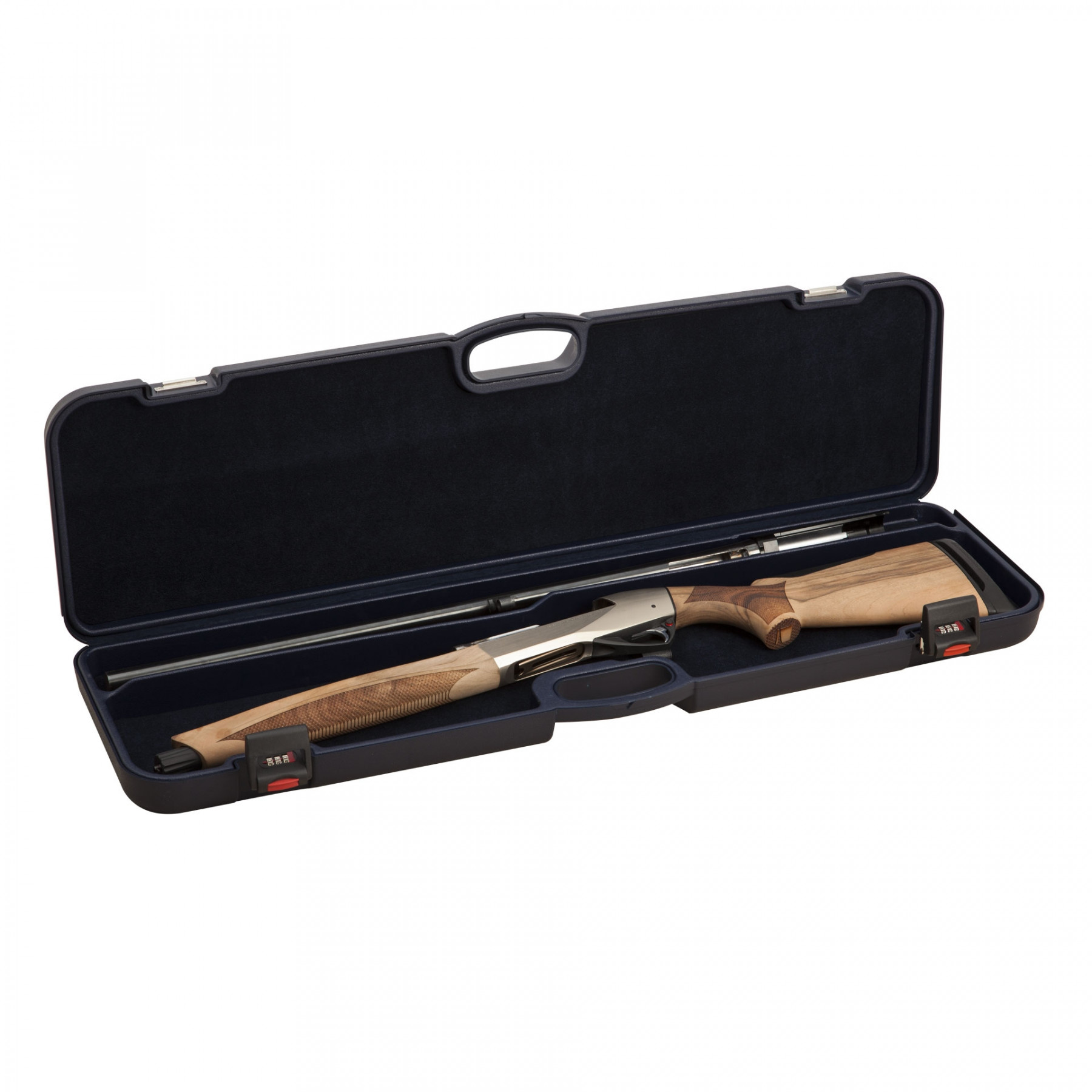 Seu interior é forrado em veludo luxuoso e conta com divisórias, separando a coronha e tenha do cano, protegendo principalmente a coronha e telha da sua semi-automática contra riscos.
